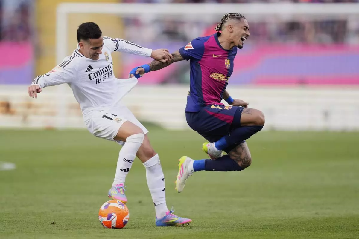 Barcelona's Raphinha, right, and Real Madrid's Lucas Vazquez fight for the ball during the Spanish La Liga soccer match between Barcelona and Real Madrid at the Lluis Companys Olympic Stadium in Barcelona, Spain, Sunday, May 11, 2025. (AP Photo/Jose Breton)