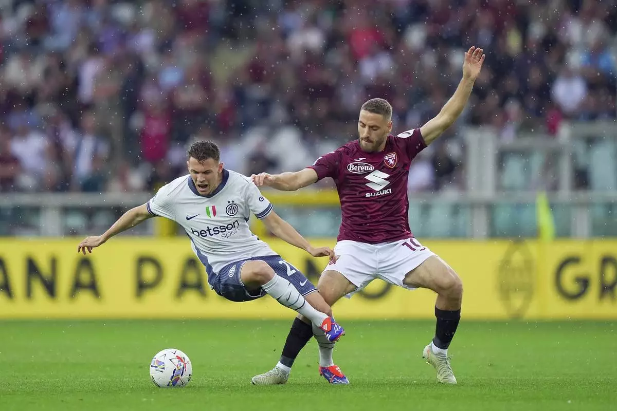 Torino's Nikola Vlasic, right, and Inter's Kristjan Asllani challenge for the ball during a Serie A soccer match between FC Torino and Inter Milan in Turin, Italy, Sunday , May 11 , 2025. (Spada/LaPresse via AP)