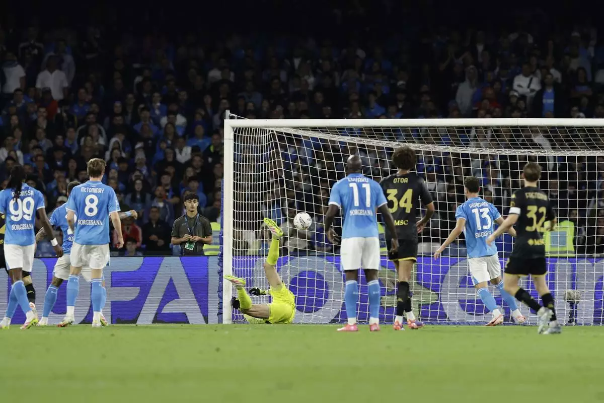 Napoli's Alex Meret deflects the ball into his own net during a Serie A soccer match against Genoa at the Diego Armando Maradona Stadium in Naples, southern Italy, Sunday, May 11, 2025. (Alessandro Garofalo/LaPresse via AP)