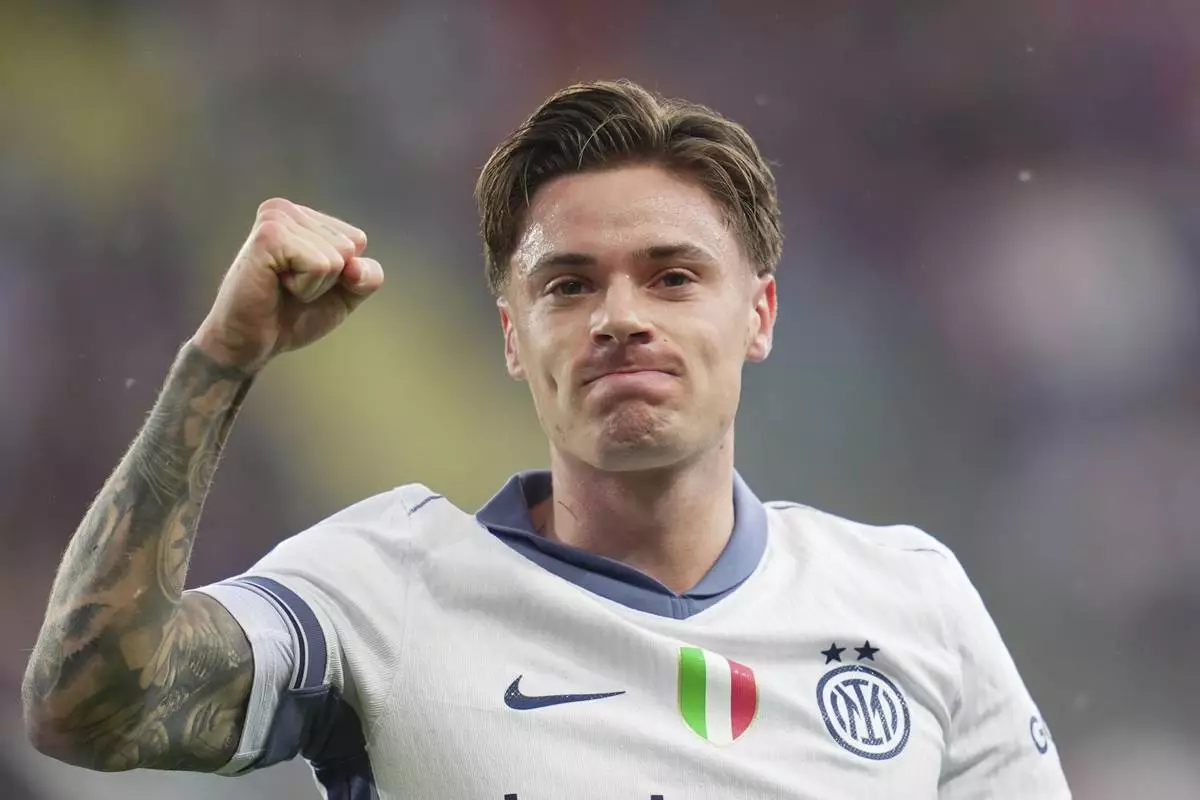 Inter Milan's Nicola Zalewski celebrates after scoring the opening goal during a Serie A soccer match between FC Torino and Inter Milan in Turin, Italy, Sunday , May 11 , 2025. (Spada/LaPresse via AP)