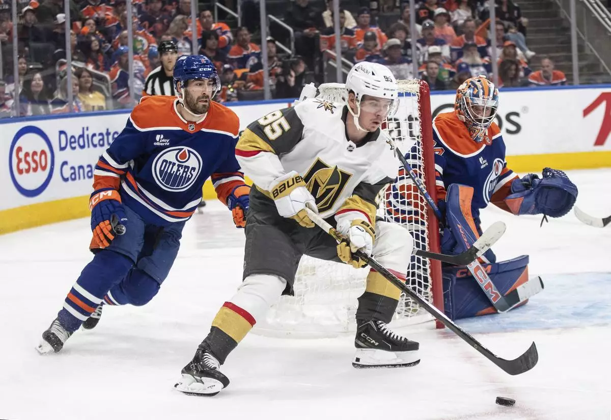 Vegas Golden Knights' Victor Olofsson (95) is chased by Edmonton Oilers' Evan Bouchard (2) as goalie Stuart Skinner (74) looks for the puck during third period NHL playoff action in Edmonton on Saturday, May 10, 2025. (Jason Franson/The Canadian Press via AP)