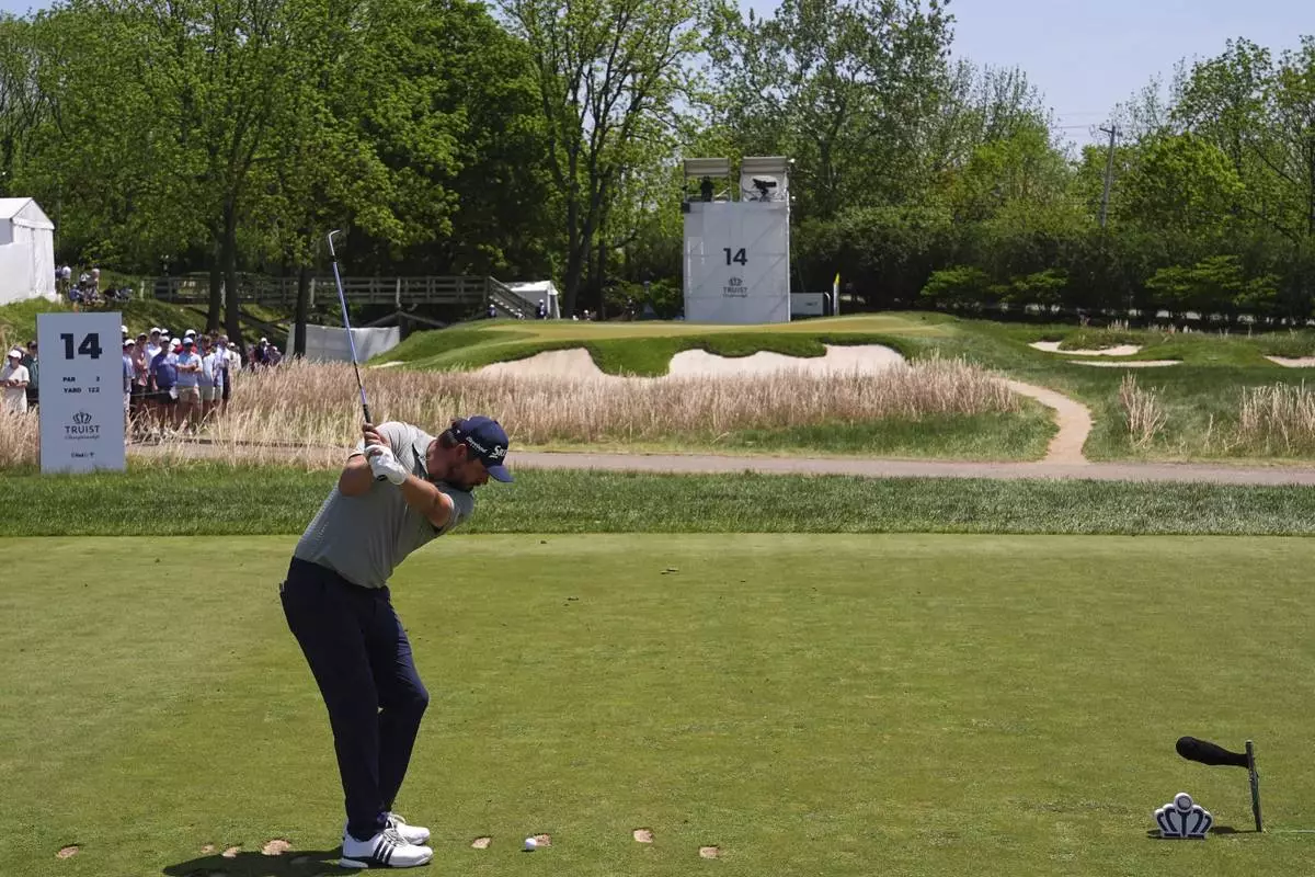 Andrew Novak hits on the 14th hole during the final round of the Truist Championship golf tournament at the Philadelphia Cricket Club, Sunday, May 11, 2025, in Flourtown. (AP Photo/Matt Rourke)