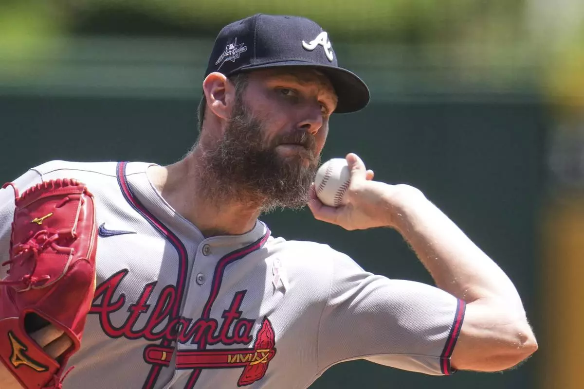 Atlanta Braves pitcher Chris Sale delivers during the first inning of a baseball game against the Pittsburgh Pirates in Pittsburgh, Sunday, May 11, 2025. (AP Photo/Gene J. Puskar)
