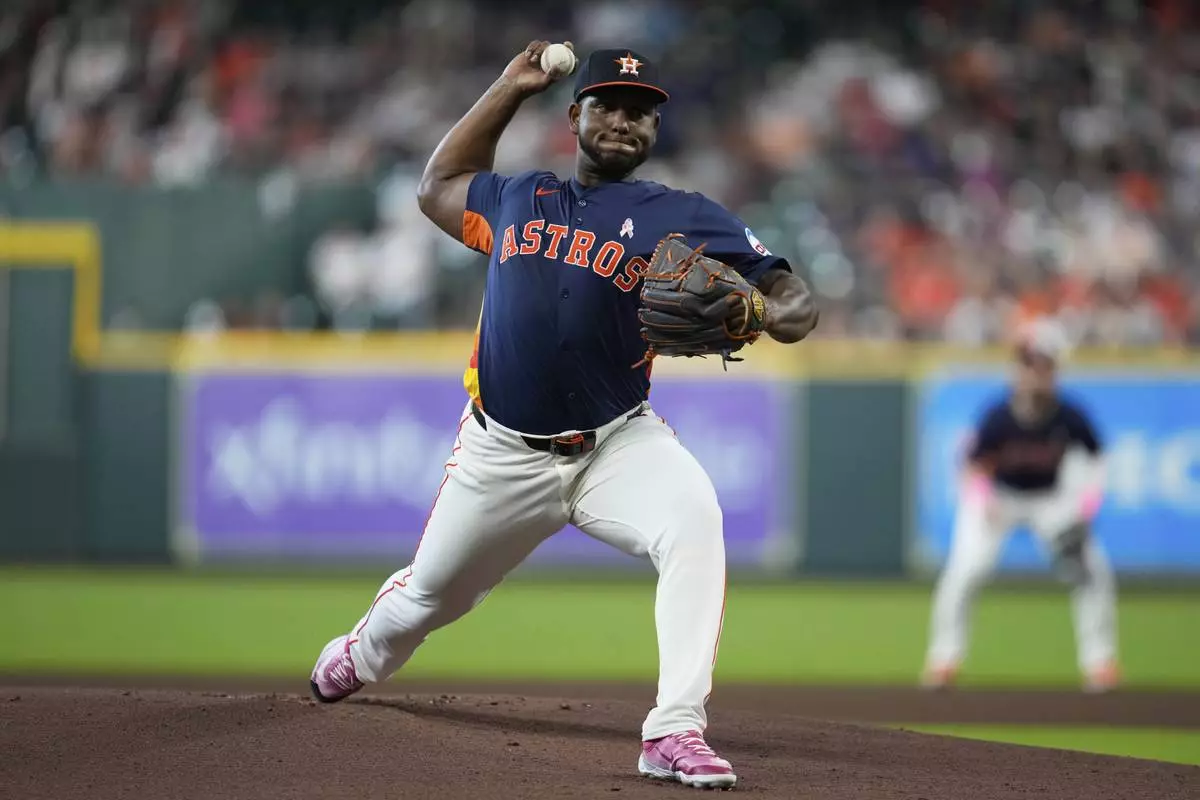 Houston Astros starting pitcher Ronel Blanco throws during the first inning of a baseball game against the Cincinnati Reds in Houston, Sunday, May 11, 2025. (AP Photo/Ashley Landis)
