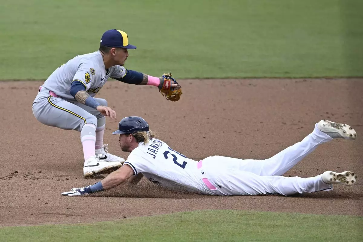 Tampa Bay Rays' Travis Jankowski, right, slides safely into second base for a double as Milwaukee Brewers shortstop Joey Ortiz, left, is late with the tag during the fourth inning of a baseball game, Sunday, May 11, 2025, in Tampa, Fla. (AP Photo/Phelan M. Ebenhack)