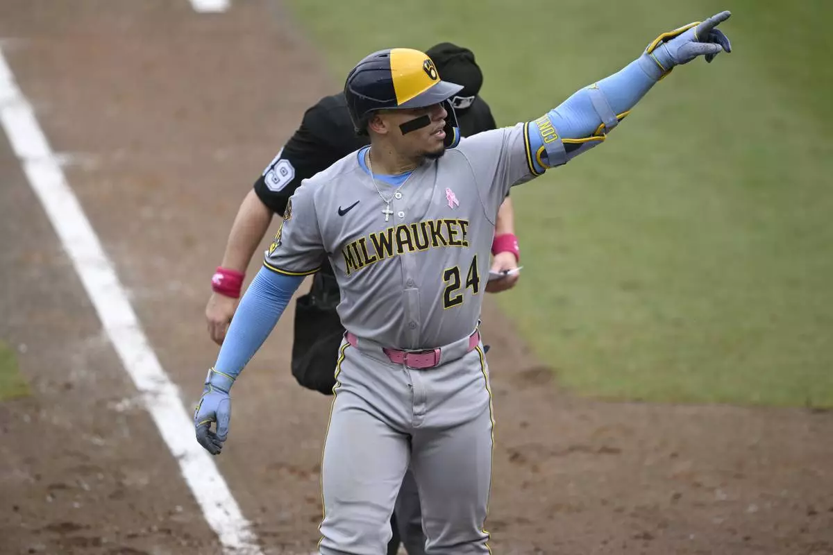 Milwaukee Brewers' William Contreras (24) points toward the stands after hitting a solo home run during the fourth inning of a baseball game against the Tampa Bay Rays, Sunday, May 11, 2025, in Tampa, Fla. (AP Photo/Phelan M. Ebenhack)