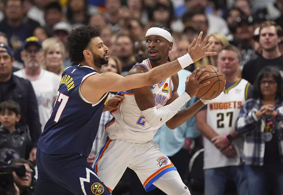 Oklahoma City Thunder guard Shai Gilgeous-Alexander, right, looks to pass the ball as Denver Nuggets guard Jamal Murray, left, defends in the first half of Game 4 in the Western Conference semifinals of the NBA basketball playoffs Sunday, May 11, 2025, in Denver. (AP Photo/David Zalubowski)