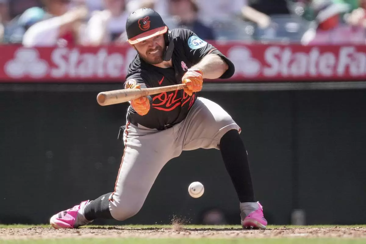 Baltimore Orioles' Maverick Handley bunts during the sixth inning of a baseball game against the Los Angeles Angels, Sunday, May 11, 2025, in Anaheim, Calif. (AP Photo/Eric Thayer)