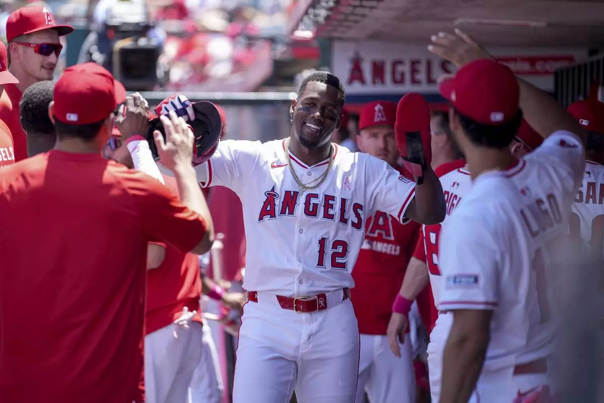 Los Angeles Angels' Jorge Soler (12) high fives teammates after scoring during the first inning of a baseball game against the Baltimore Orioles, Sunday, May 11, 2025, in Anaheim, Calif. (AP Photo/Eric Thayer)