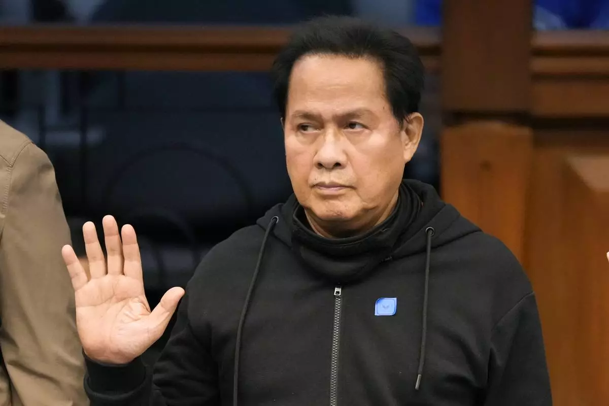 FILE - Apollo Quiboloy takes his oath as he attends a hearing at the Philippine Senate on Oct. 23, 2024, in Manila, Philippines. (AP Photo/Aaron Favila, file)