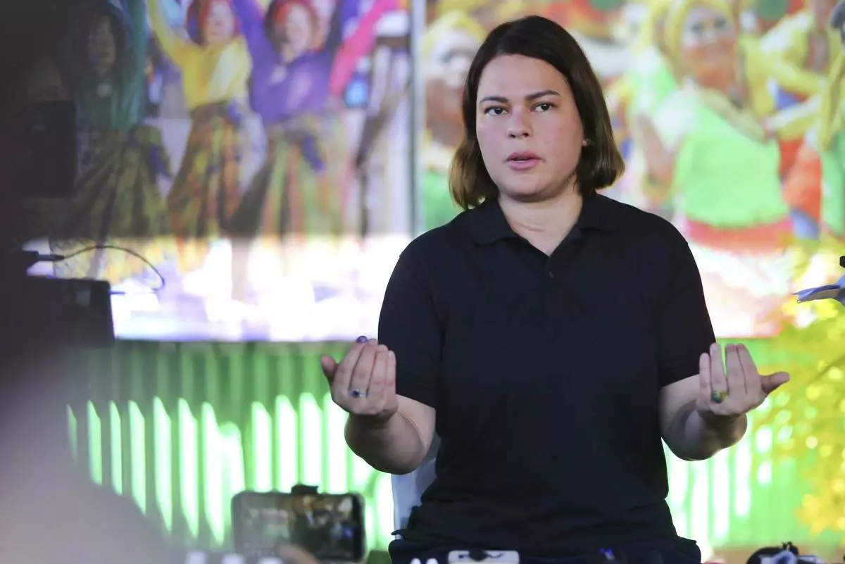 FILE - Philippine Vice President Sara Duterte gestures as she speaks during a press conference in Manila, Philippines on Feb. 7, 2025. (AP Photo/Basilio Sepe, File)