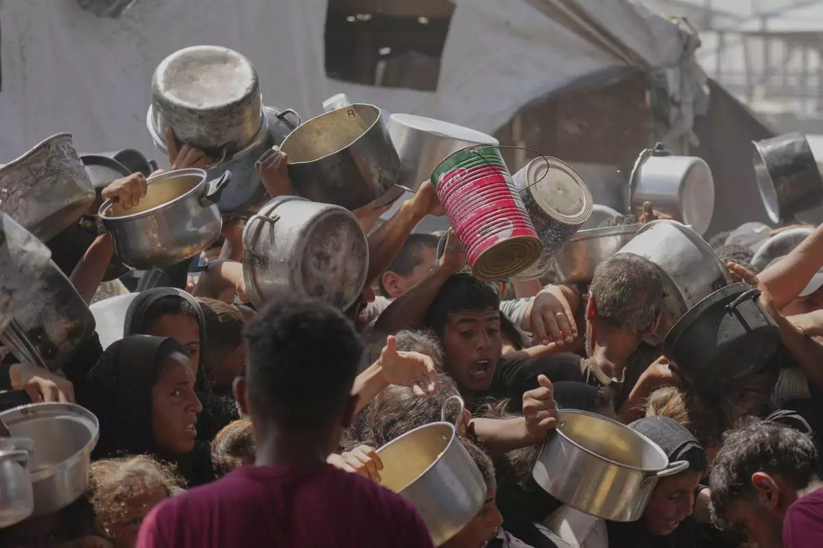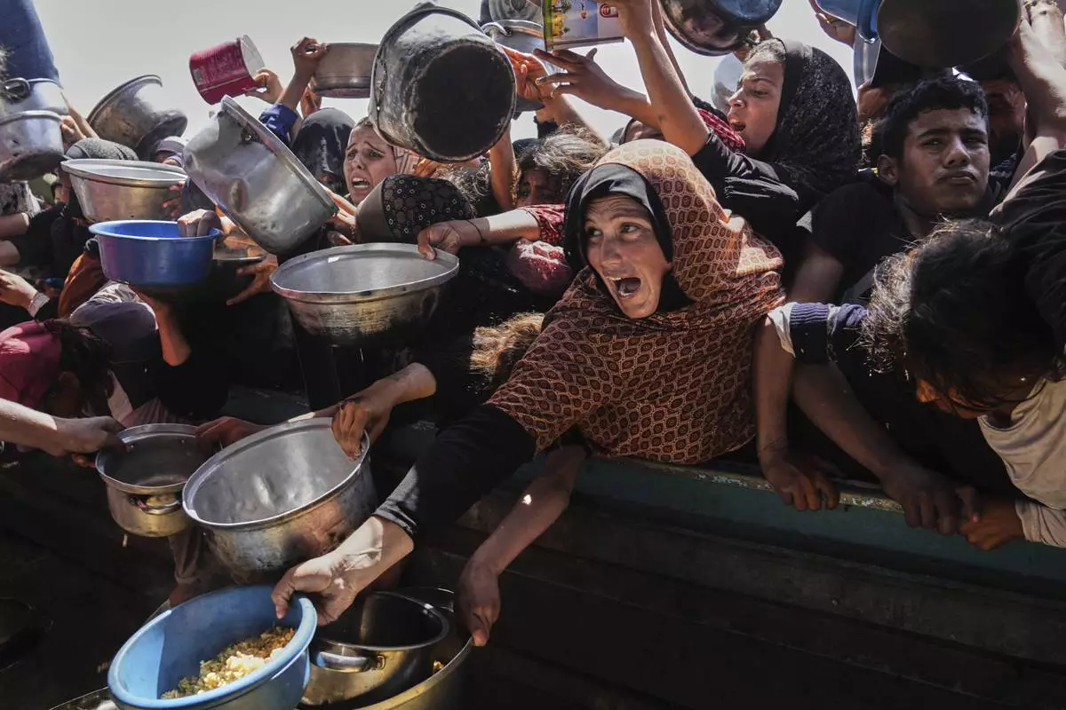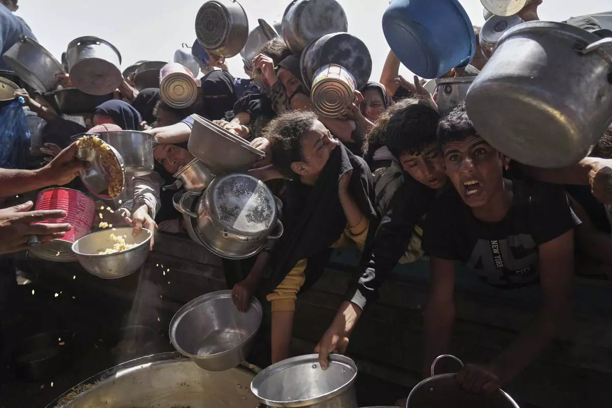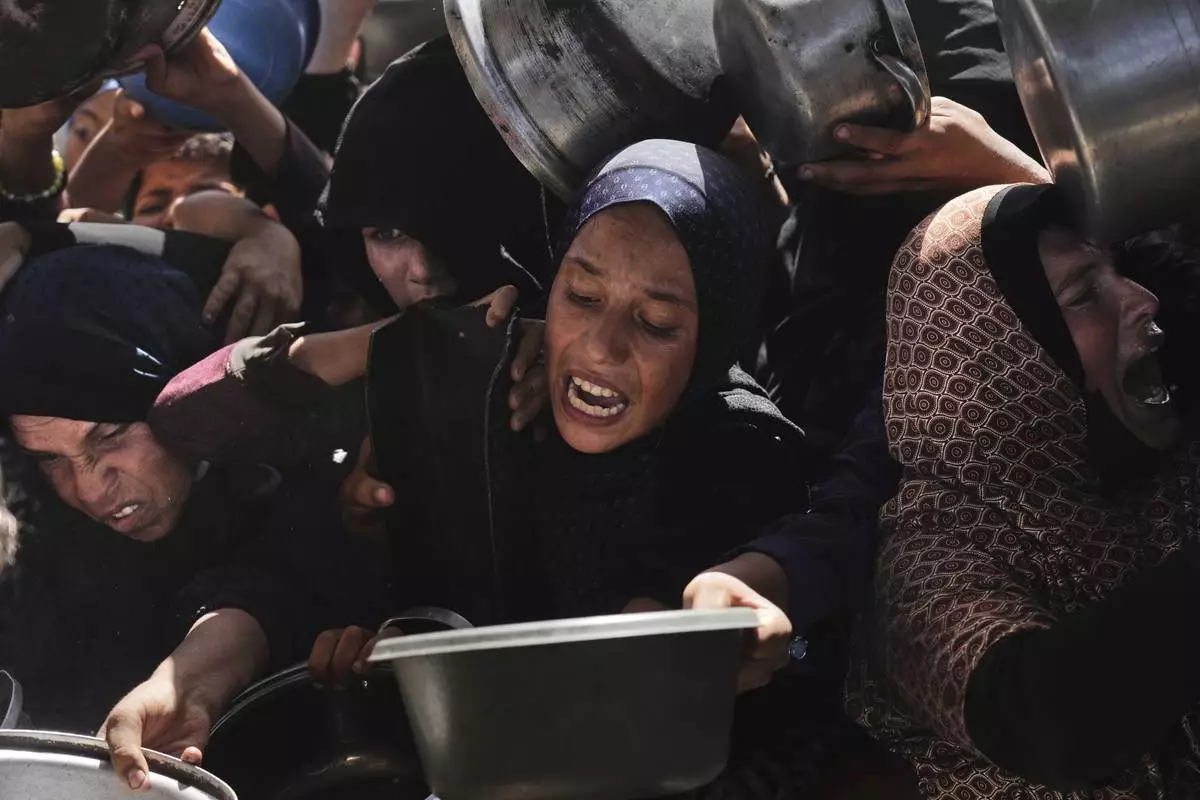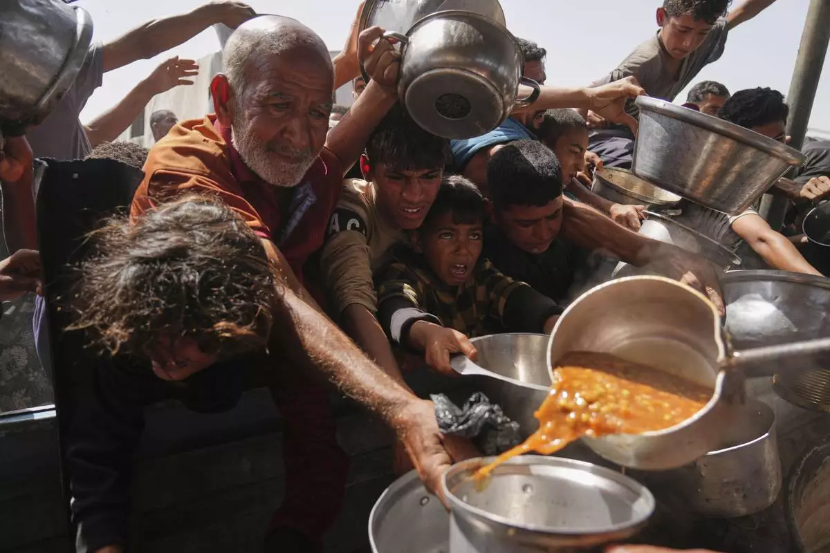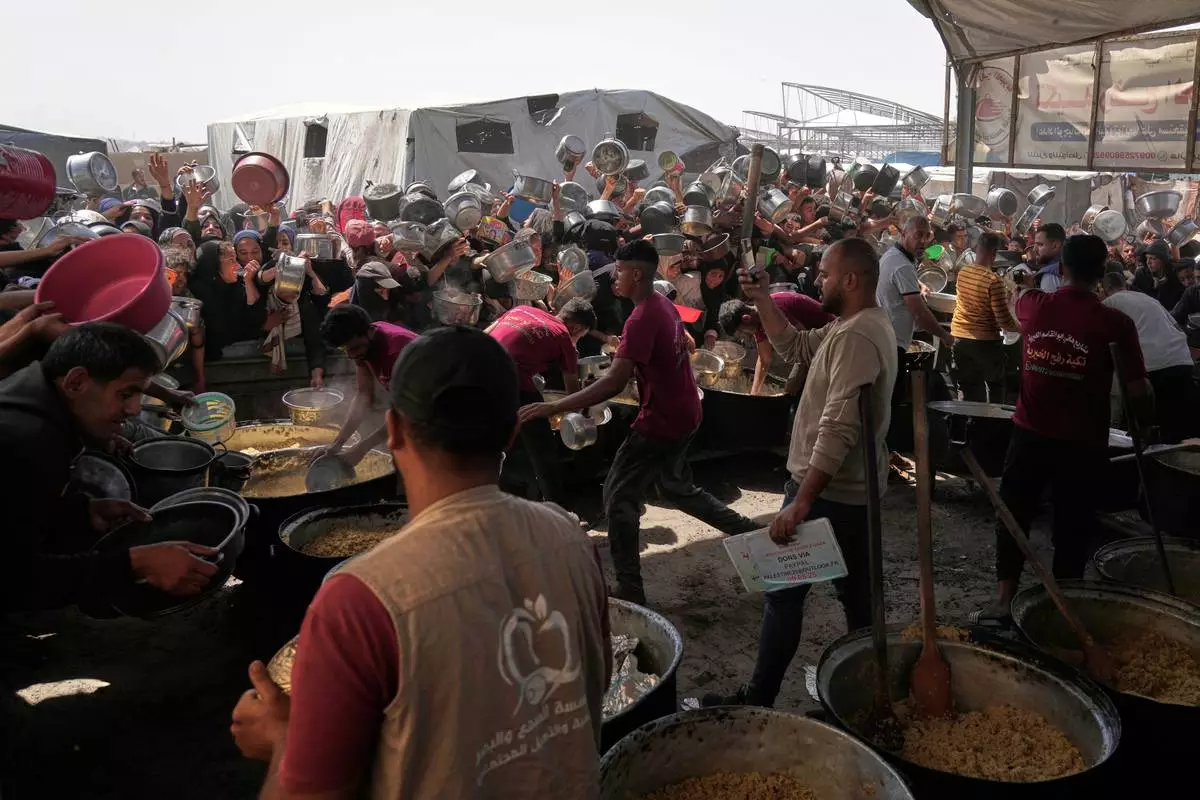 Palestinians struggle to get donated food at a community kitchen in Khan Younis, Gaza Strip, Sunday, May 11, 2025. (AP Photo/Abdel Kareem Hana)