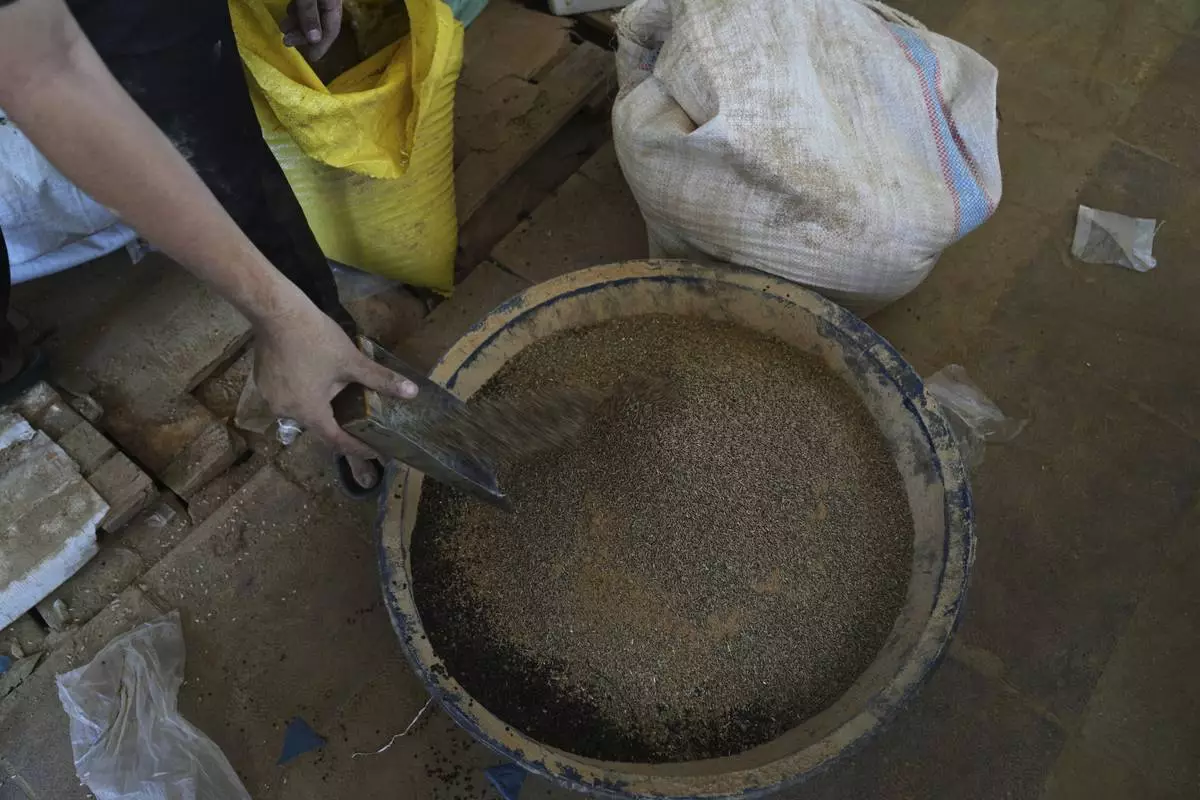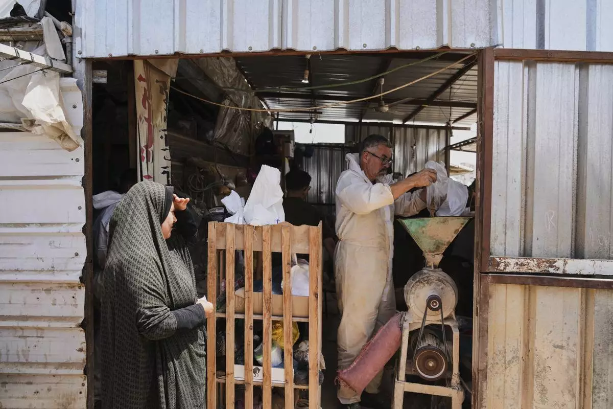 Displaced Palestinians purchase ground lentils as a substitute for making bread due to a shortage of flour in the Gaza Strip, in Khan Younis, on Sunday, May 11, 2025. (AP Photo/Abdel Karem Hanna)