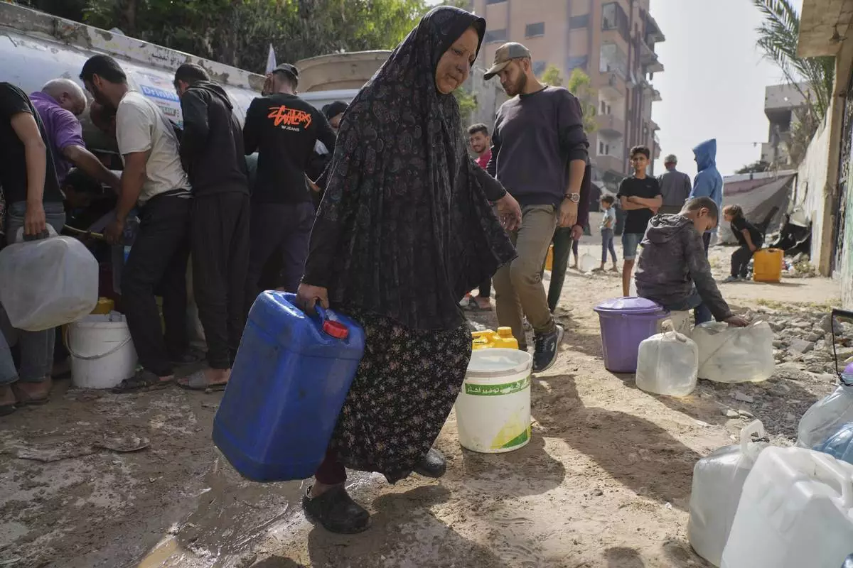 Palestinians collect water in jerrycans at a distribution point west of Gaza City, Sunday, May 11, 2025. (AP Photo/Jehad Alshrafi)