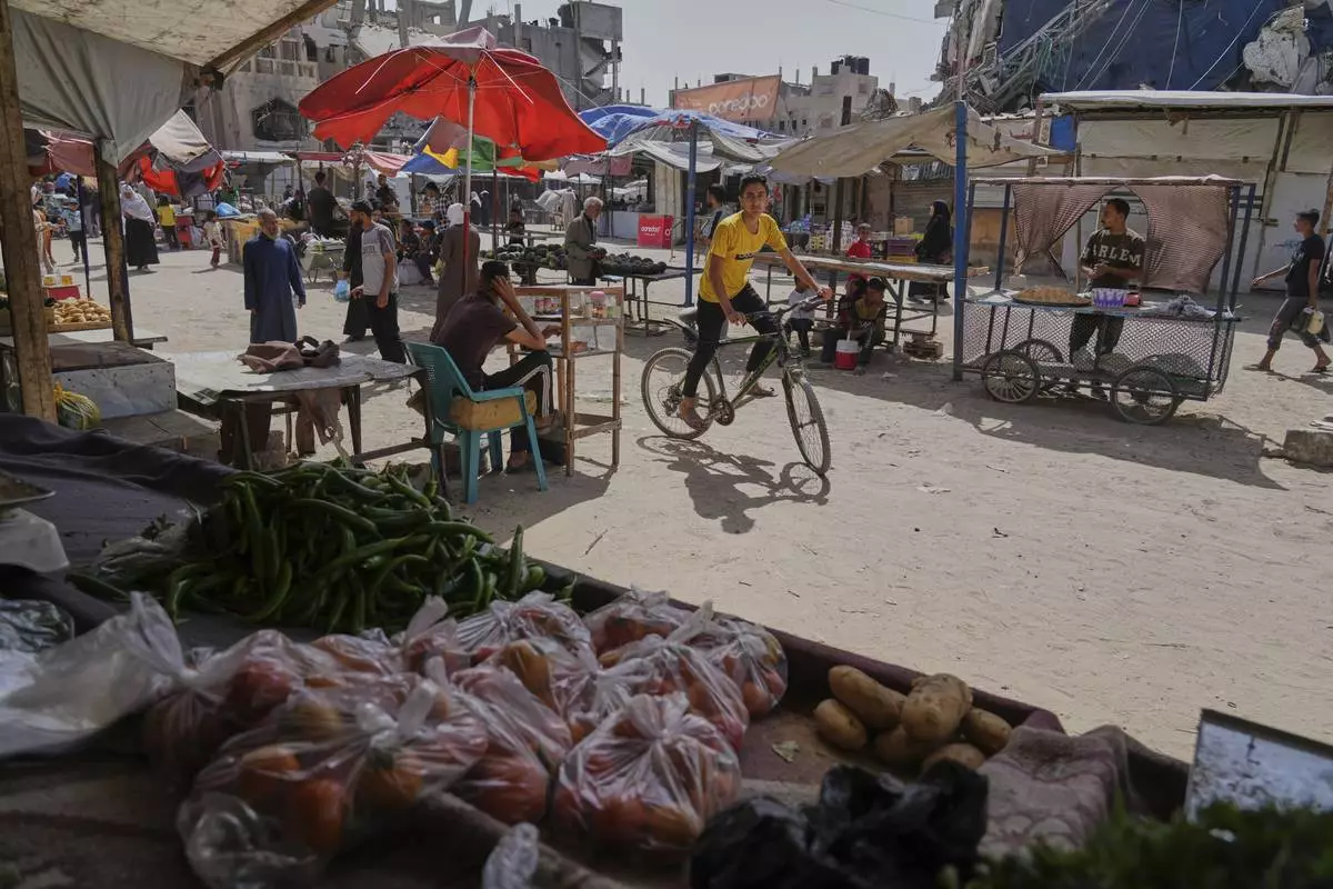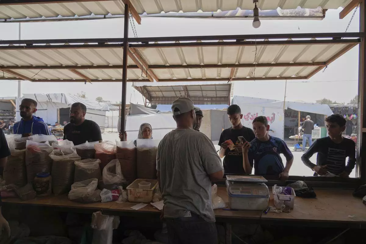 Palestinians purchase goods at a makeshift market in Khan Younis, Gaza Strip, Sunday, May 11, 2025. (AP Photo/Abdel Kareem Hana)