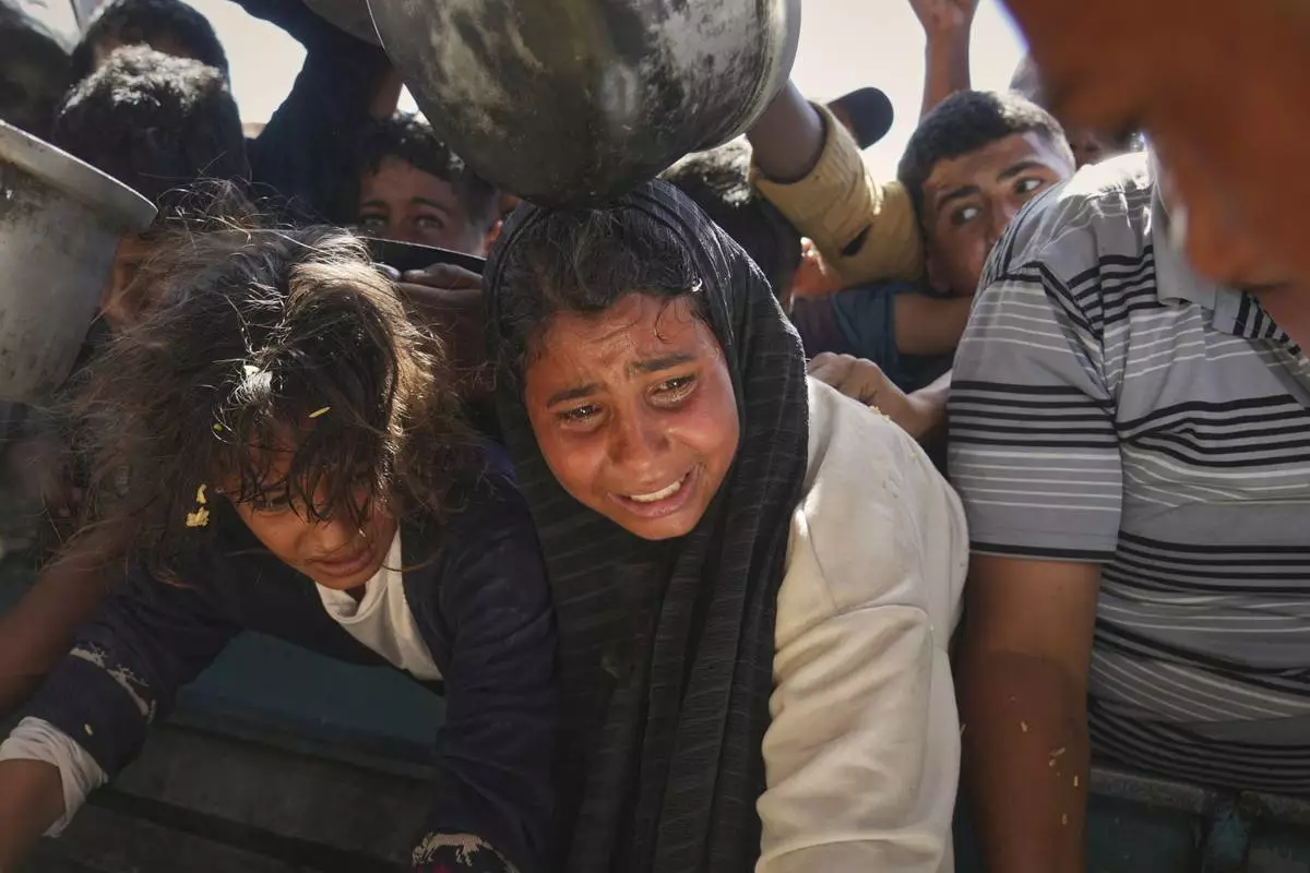 A Palestinian girl struggles to obtain donated food at a community kitchen in Khan Younis, in the southern Gaza Strip, Friday, May 9, 2025. (AP Photo/Abdel Kareem Hana)