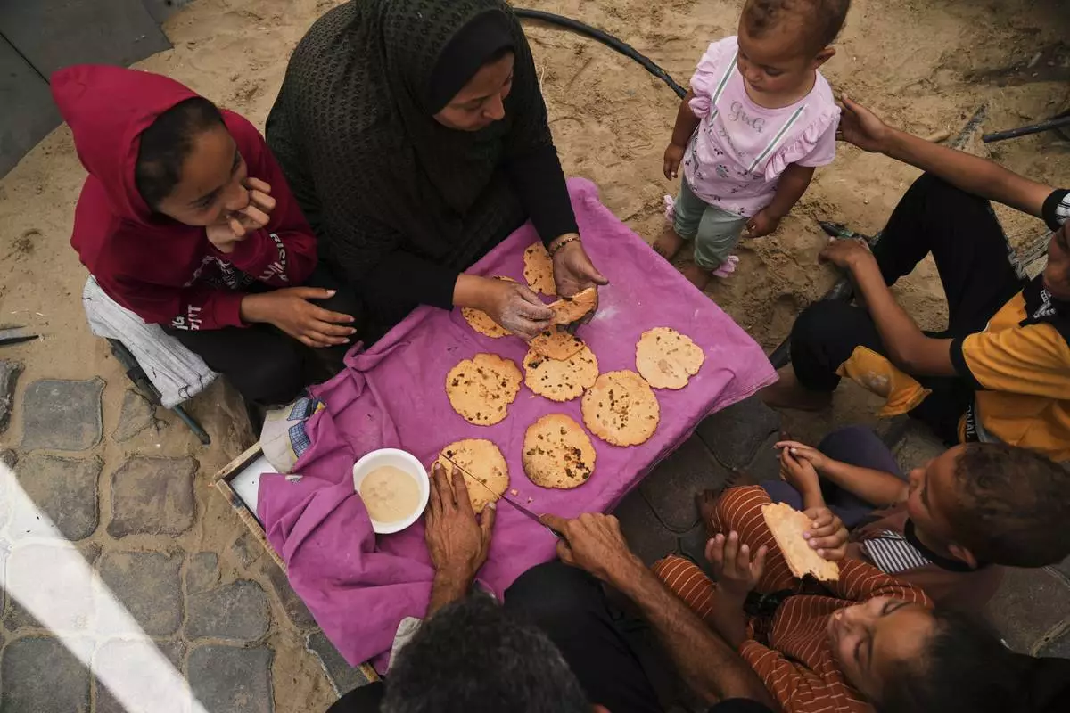 Nevin Qassim, a displaced Palestinian woman, and her family eat bread she baked from ground lentils as a substitute amid a flour shortage in the Gaza Strip, in Khan Younis, on Sunday, May 11, 2025. (AP Photo/Abdel Kareem Hana)