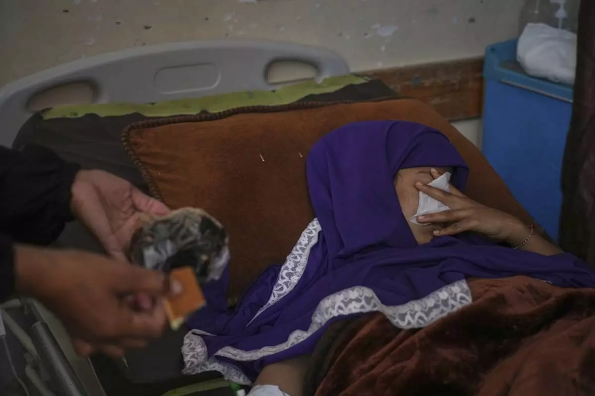 Another patient at Nasser Hospital, 19-year-old Asmaa Faraj, had shrapnel in her chest from an airstrike that hit close to her tent and a nearby charity kitchen in camps for displaced people outside Khan Younis.