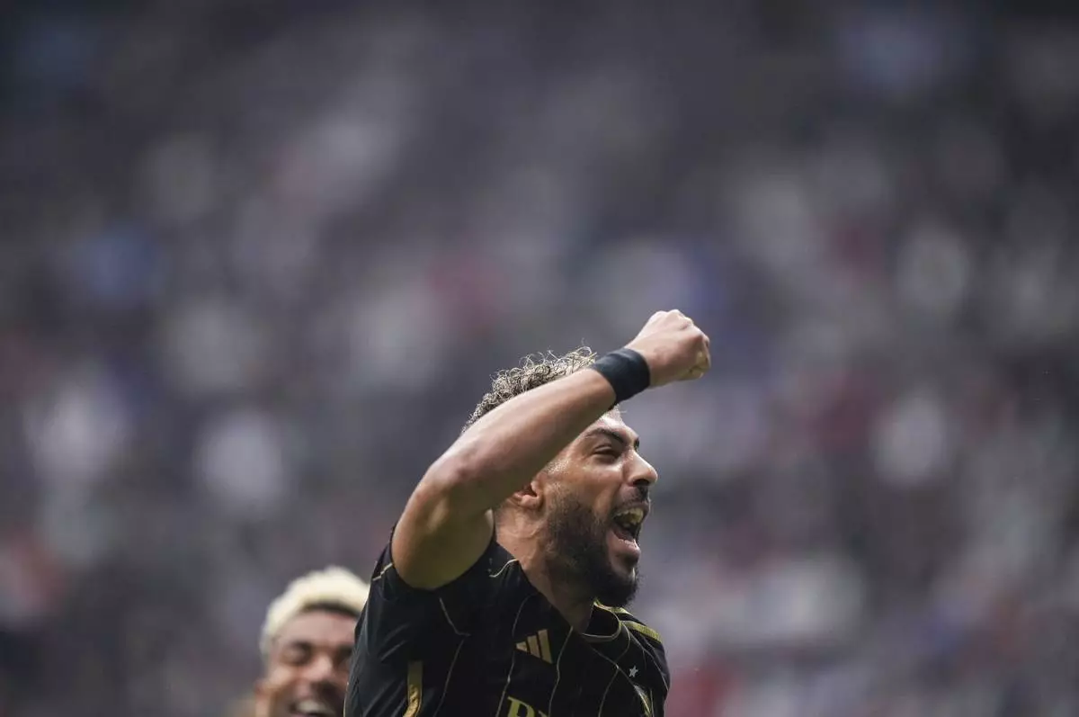Los Angeles FC's Denis Bouanga celebrates after his penalty kick goal against the Vancouver Whitecaps during the first half of an MLS soccer match in Vancouver, British Columbia, Sunday, May 11, 2025. (Darryl Dyck/The Canadian Press via AP)