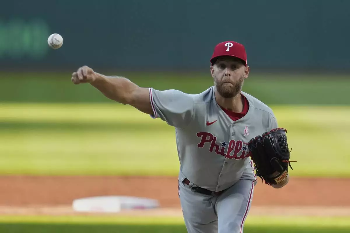 Philadelphia Phillies starting pitcher Zack Wheeler pitches in the first inning of a baseball game against the Cleveland Guardians in Cleveland, Sunday, May 11, 2025. (AP Photo/Sue Ogrocki)