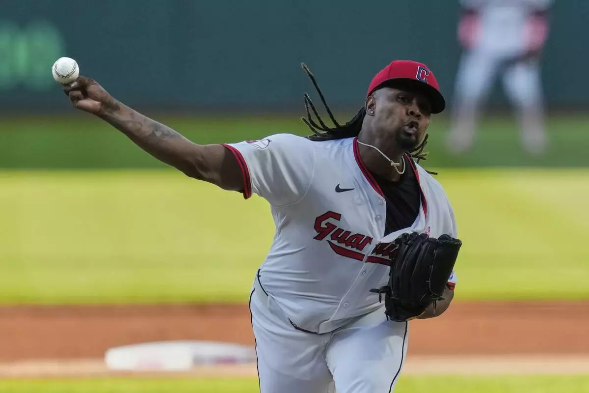 Cleveland Guardians' Luis Ortiz pitches in the first inning of a baseball game against the Philadelphia Phillies in Cleveland, Sunday, May 11, 2025. (AP Photo/Sue Ogrocki)