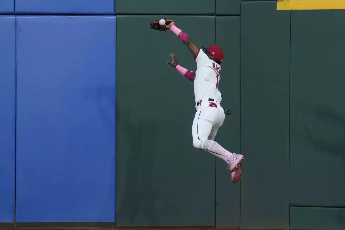 Cleveland Guardians center fielder Angel Martinez (1) jumps for the ball hit for a double by Philadelphia Phillies' J.T. Realmuto in the second inning of a baseball game in Cleveland, Sunday, May 11, 2025. (AP Photo/Sue Ogrocki)