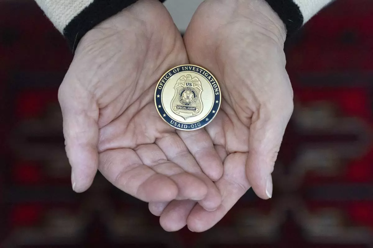 Cathy Votaw, 69, holds a coin from the USAID Office of Investigations, Thursday, Feb. 27, 2025, in Washington. (AP Photo/Jacquelyn Martin)