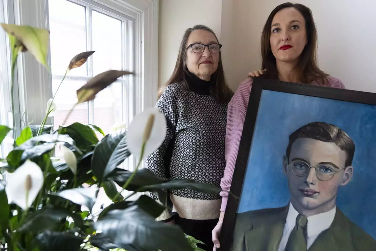 Cathy Votaw, 69, left, and her daughter Anna Eisenberg, pose with a painting of Votaw's father, Albert Votaw, portrayed as a young man in the 1940's, Thursday, Feb. 27, 2025, at their home in Washington. (AP Photo/Jacquelyn Martin)