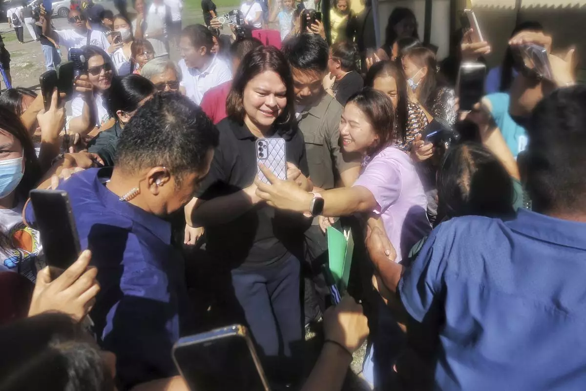 Philippine Vice President Sara Duterte greets supporters as she arrives to cast her vote at a polling center in Davao City, southern Philippines, Monday, May 12, 2025. (AP Photo/Manman Dejeto)