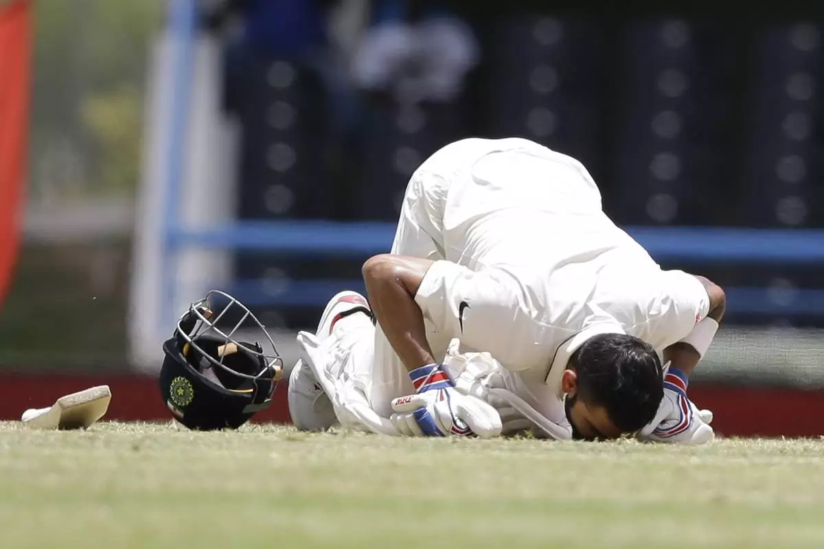 FILE - India's captain Virat Kohli kisses the field after scoring a double-century during day two of the first cricket Test match against West Indies at the Sir Vivian Richards Stadium in North Sound, Antigua, on July 22, 2016. (AP Photo/Ricardo Mazalan, File)