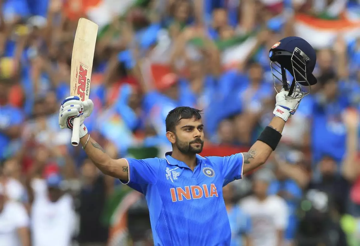 FILE - India's Virat Kohli, celebrates his hundred runs during the World Cup Pool B match against Pakistan in Adelaide, Australia, on Feb. 15, 2015. (AP Photo/James Elsby, File)