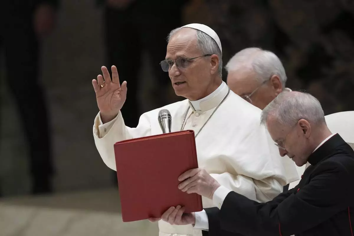 Pope Leo XIV meets members of the international media in the Paul VI Hall at the Vatican, Tuesday, May 13, 2025. (AP Photo/Domenico Stinellis)