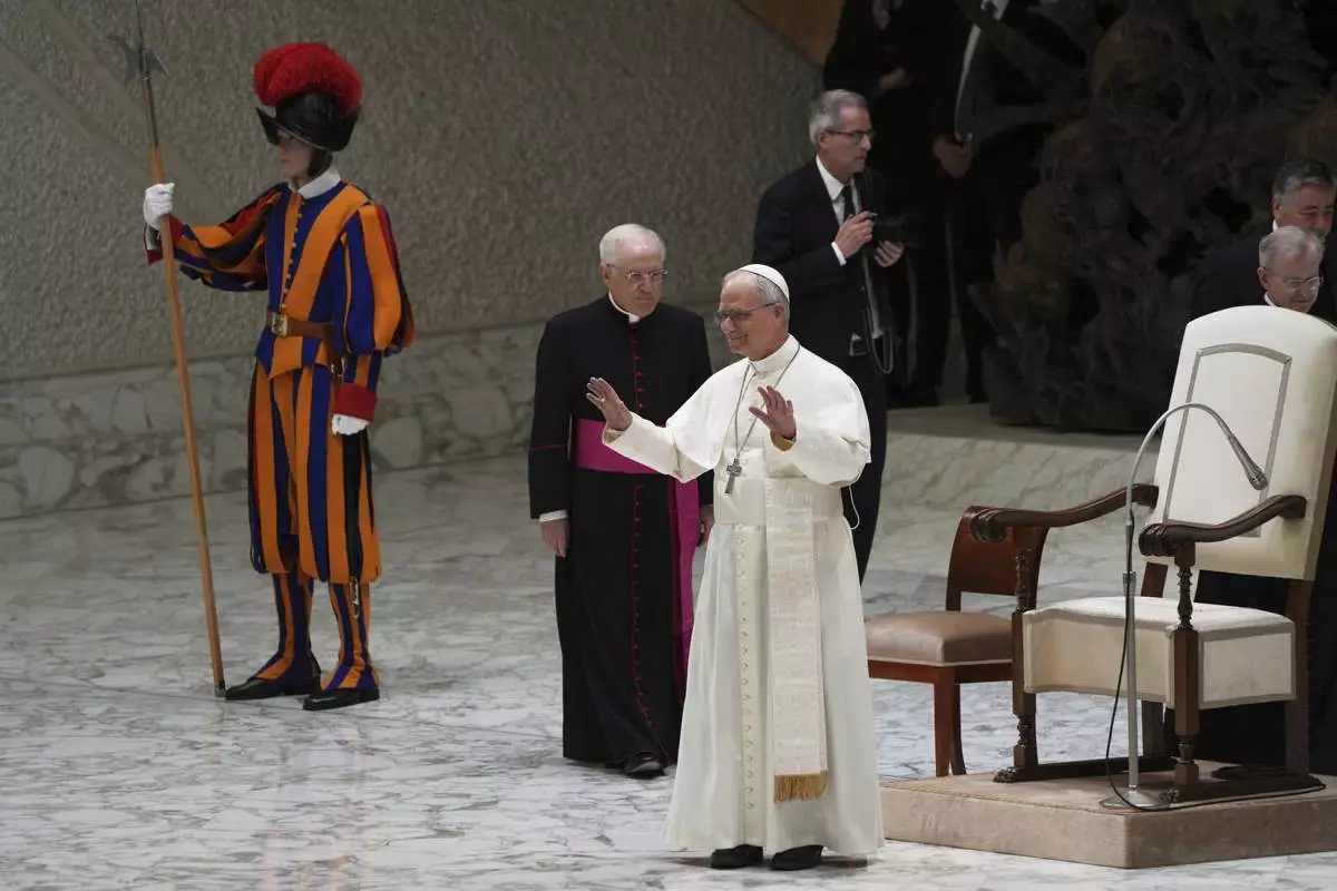 Leo received a standing ovation as he entered the Vatican auditorium for his first meeting with representatives of the general public.