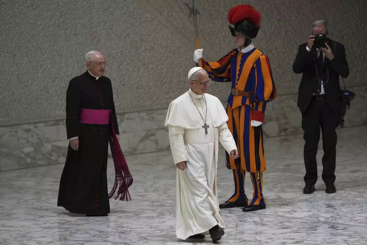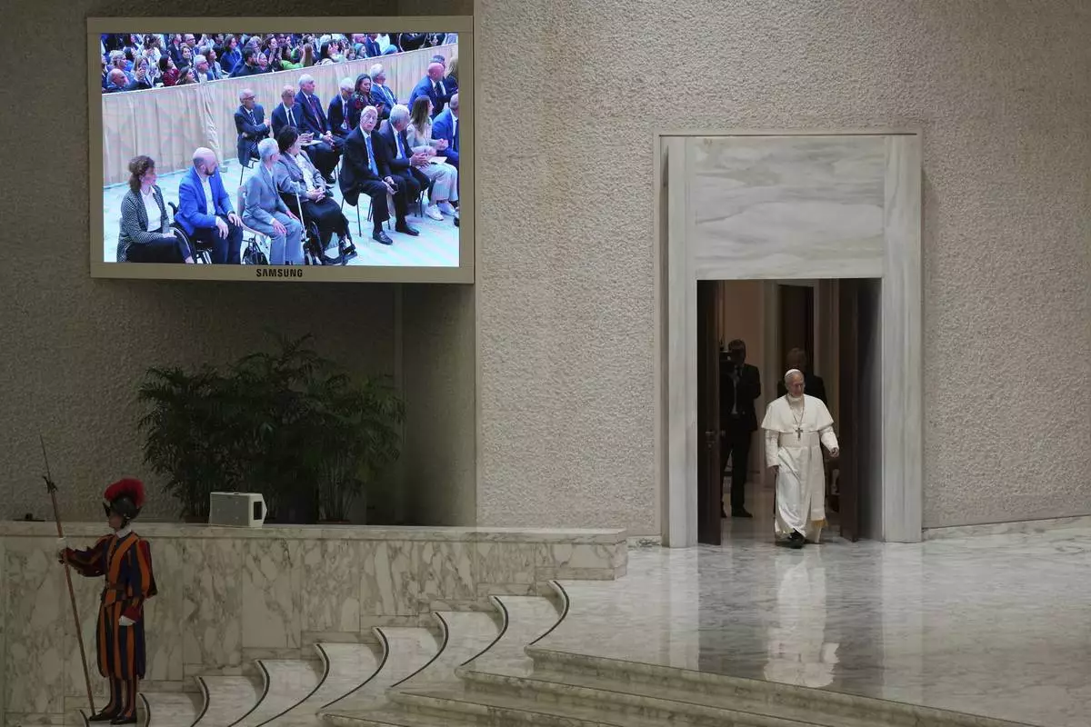 Pope Leo XIV arrives as he meets members of the international media in the Paul VI Hall at the Vatican, Tuesday, May 13, 2025. (AP Photo/Domenico Stinellis)