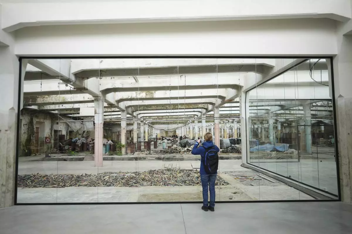 A visitor observes the Museum of Survivors, located in a factory where Oskar Schindler saved some 1200 Jews during the WWII, in Brnenec, Czech Republic, Saturday, May 10, 2025. (AP Photo/Petr David Josek)