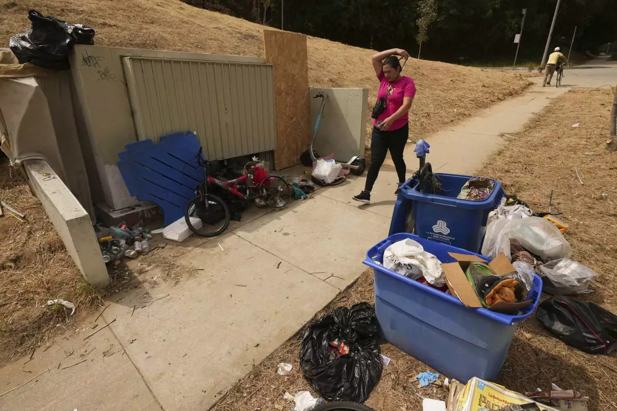 A pedestrian walks past trash left outside a bin near a homeless encampment, Monday, May 12, 2025, in Los Angeles. (AP Photo/Damian Dovarganes)