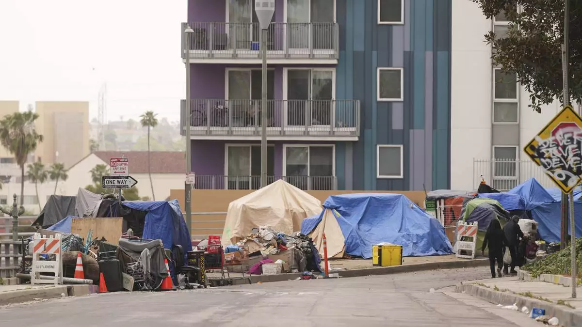 FILE - A man walks past a homeless encampment in downtown Los Angeles, Oct. 25, 2023. (AP Photo/Jae C. Hong, File)