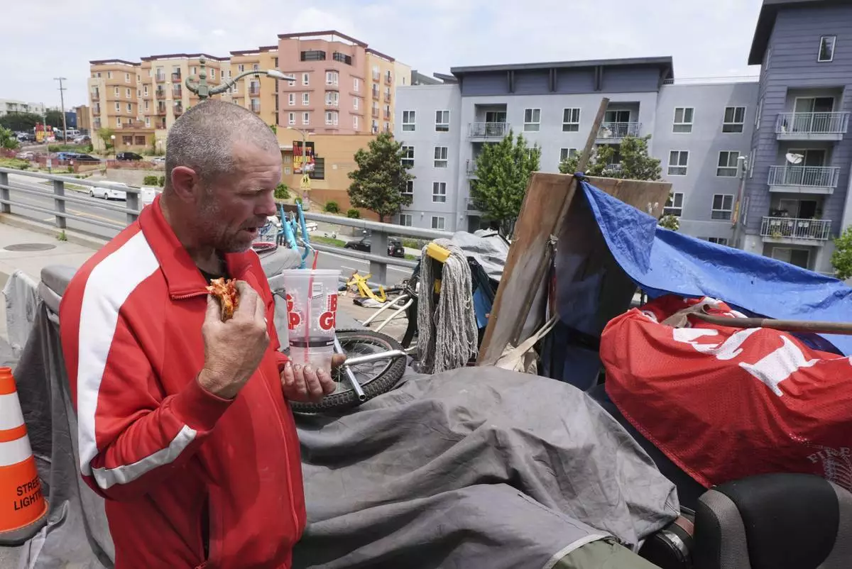 Scott Robertson Serge eats lunch in a homeless encampment where he currently lives, Monday, May 12, 2025, in Los Angeles. (AP Photo/Damian Dovarganes)