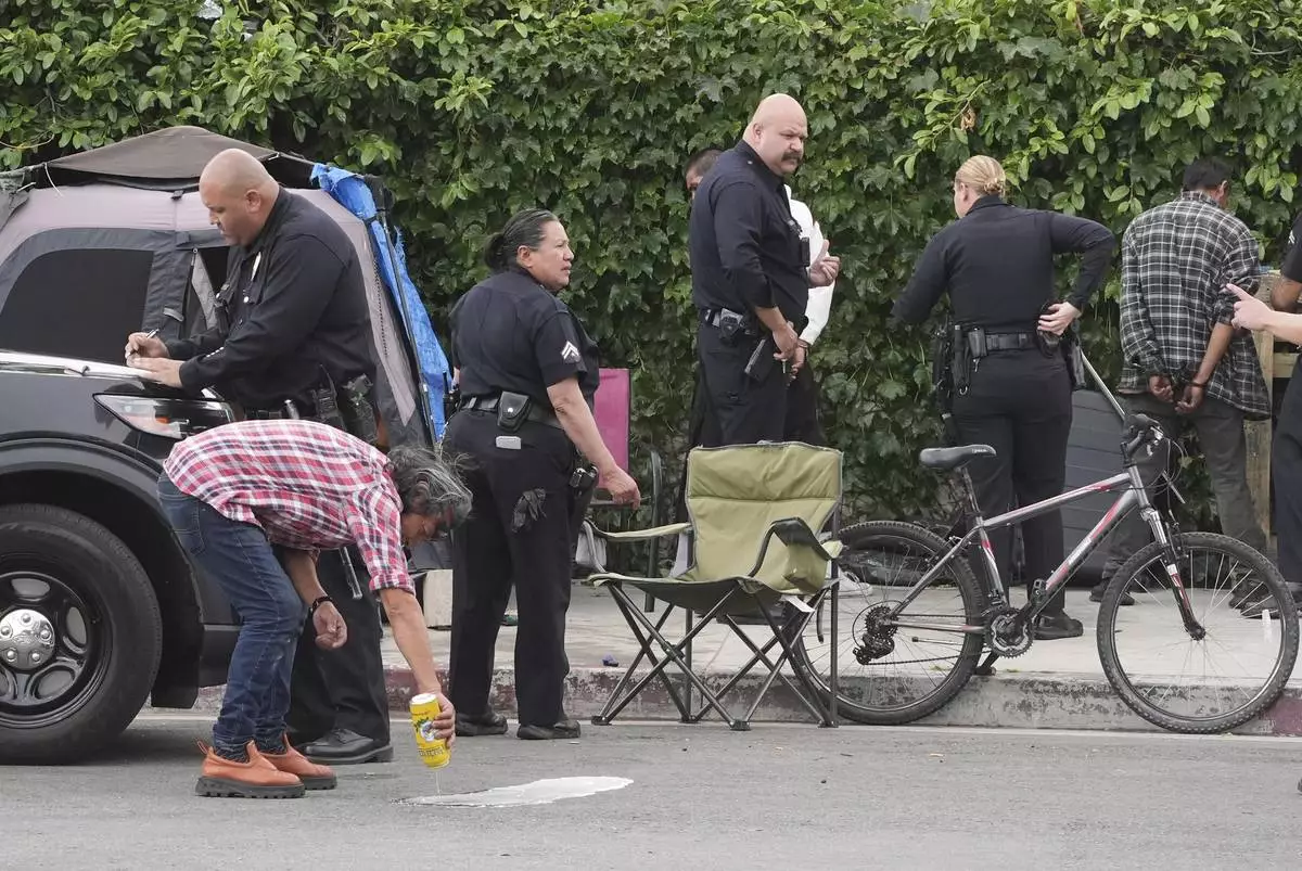 Two people are cited for drinking in public at a homeless encampment, Monday, May 12, 2025, in Los Angeles. (AP Photo/Damian Dovarganes)