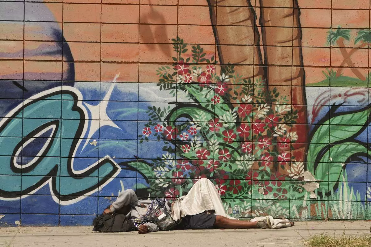 A person sleeps on a sidewalk, Monday, May 12, 2025, in Los Angeles. (AP Photo/Damian Dovarganes)