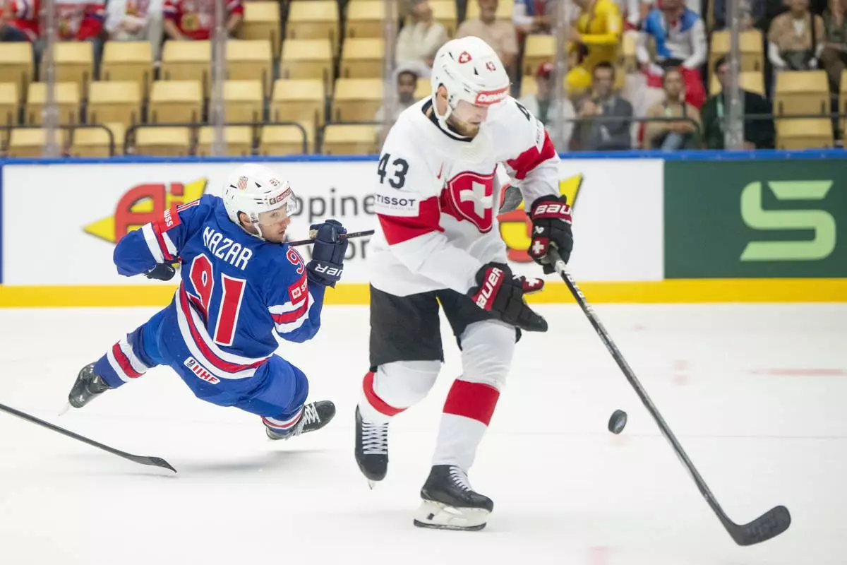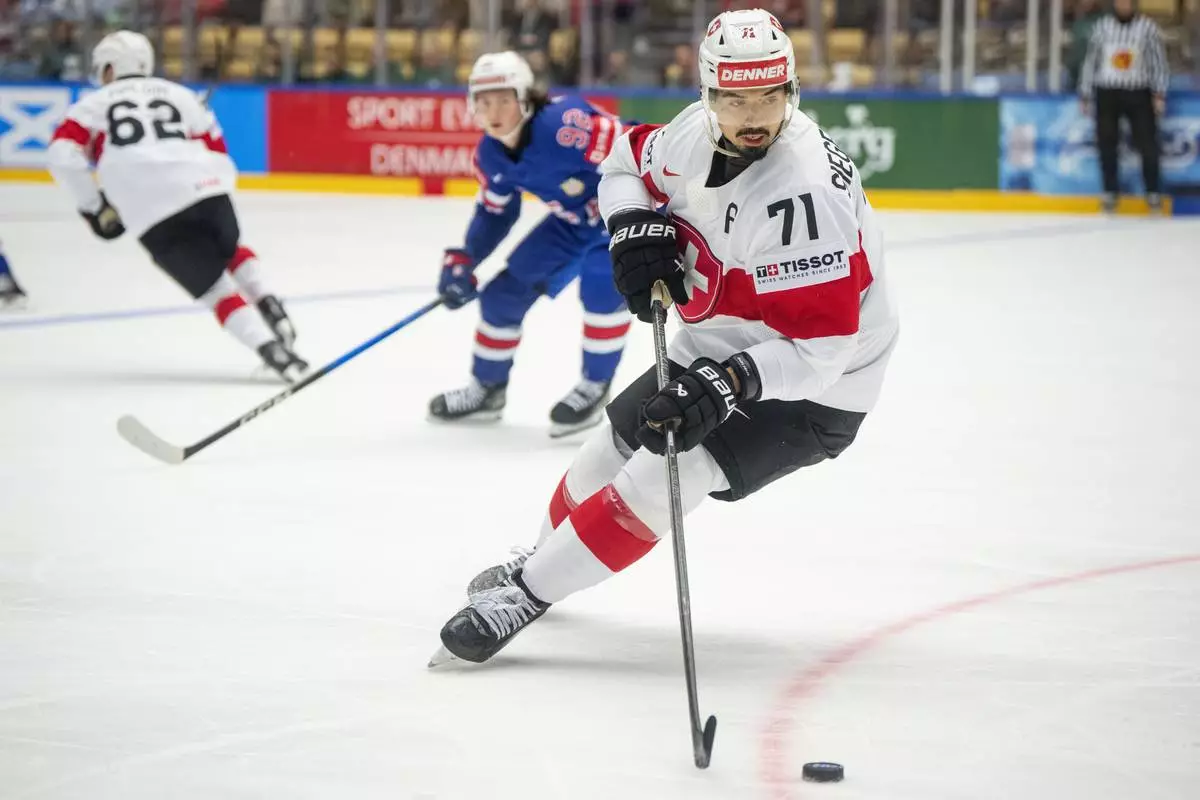 Fiala recorded an assist in his first game at the worlds. He joined the Swiss late after his Los Angeles Kings were eliminated from the NHL playoffs in the first round.