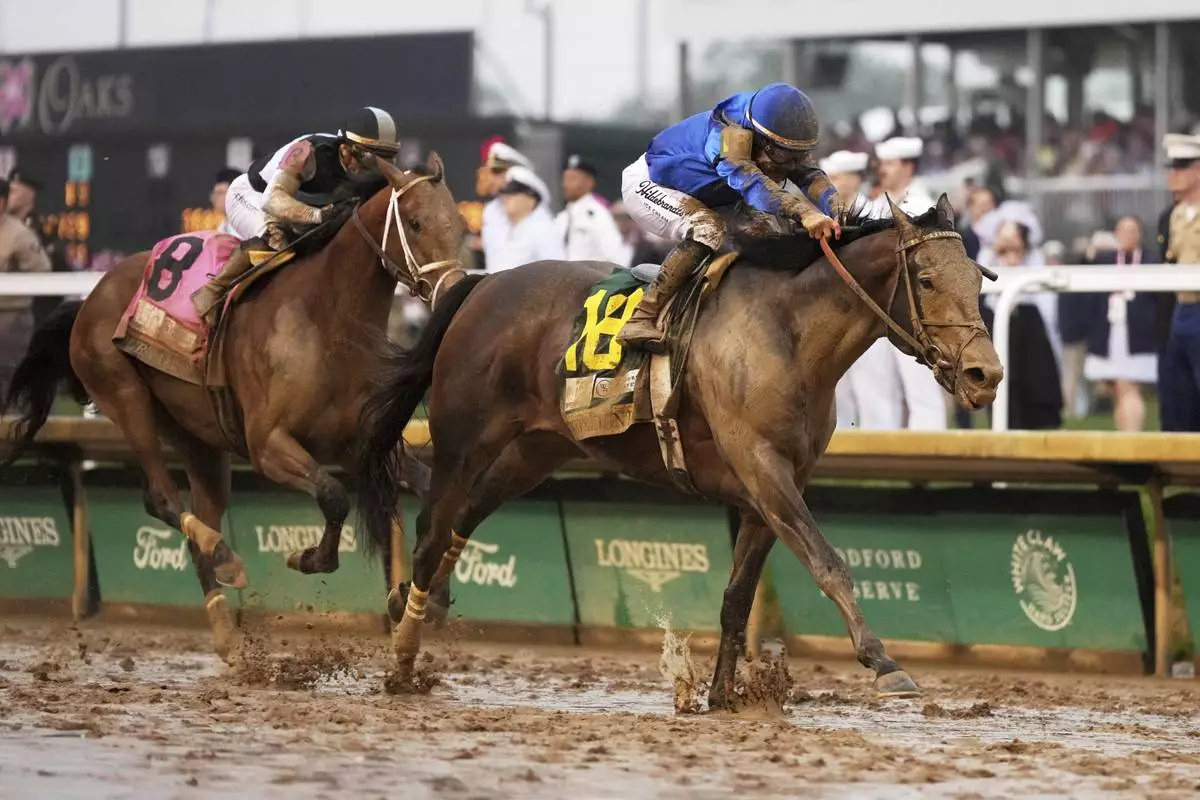 Sovereignty, right, ridden by Junior Alvarado, crosses the finish line to win the 151st running of the Kentucky Derby horse race followed by Journalism, ridden by Umberto Rispoli, at Churchill Downs Saturday, May 3, 2025, in Louisville, Ky. (AP Photo/Jeff Roberson)