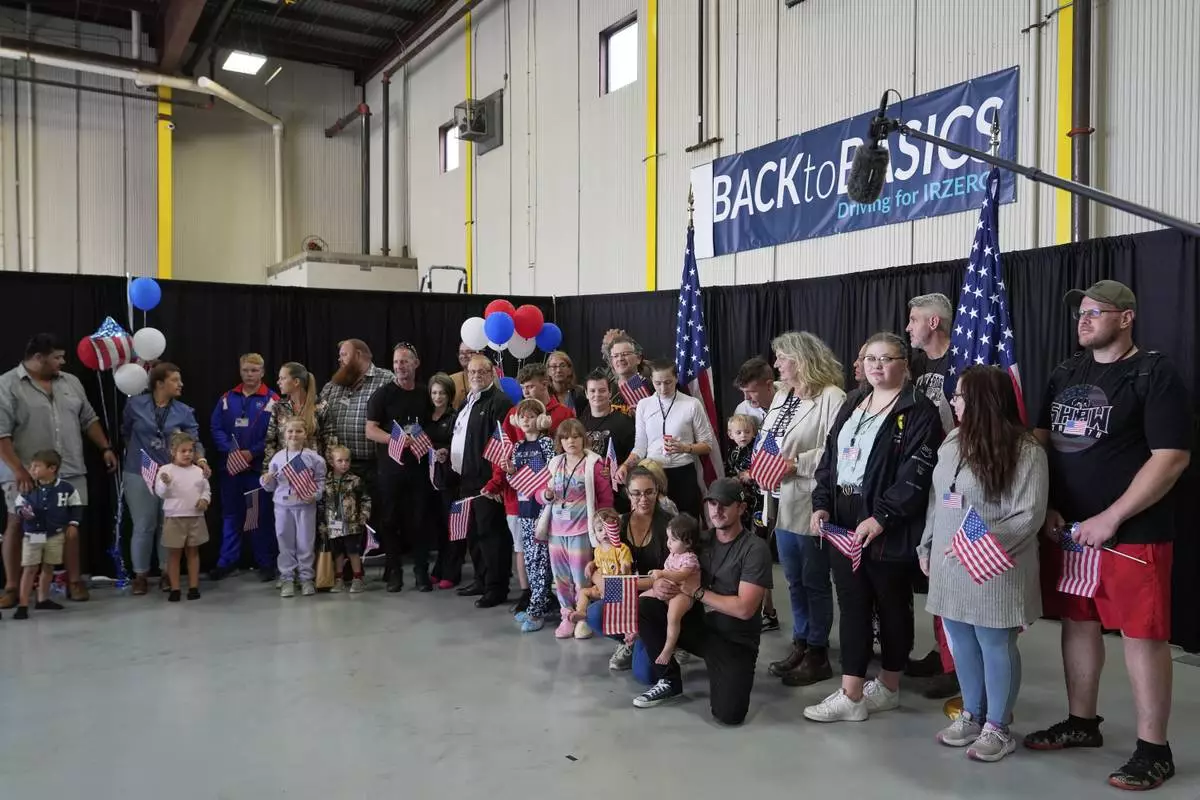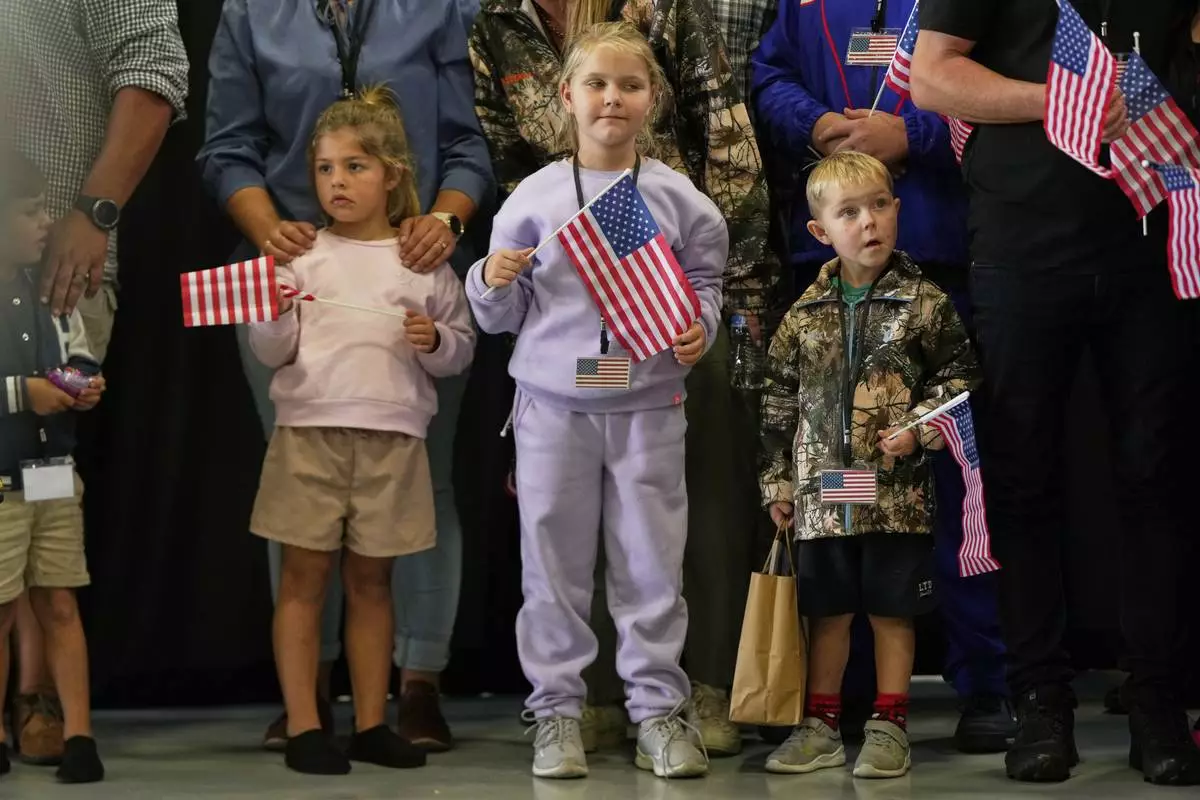 Many in the group from South Africa — including toddlers and other small children, even one walking barefoot in pajamas — held small American flags as two officials welcomed them to the United States in an airport hangar outside Washington. The South Africans were then leaving on other flights to various U.S. destinations.