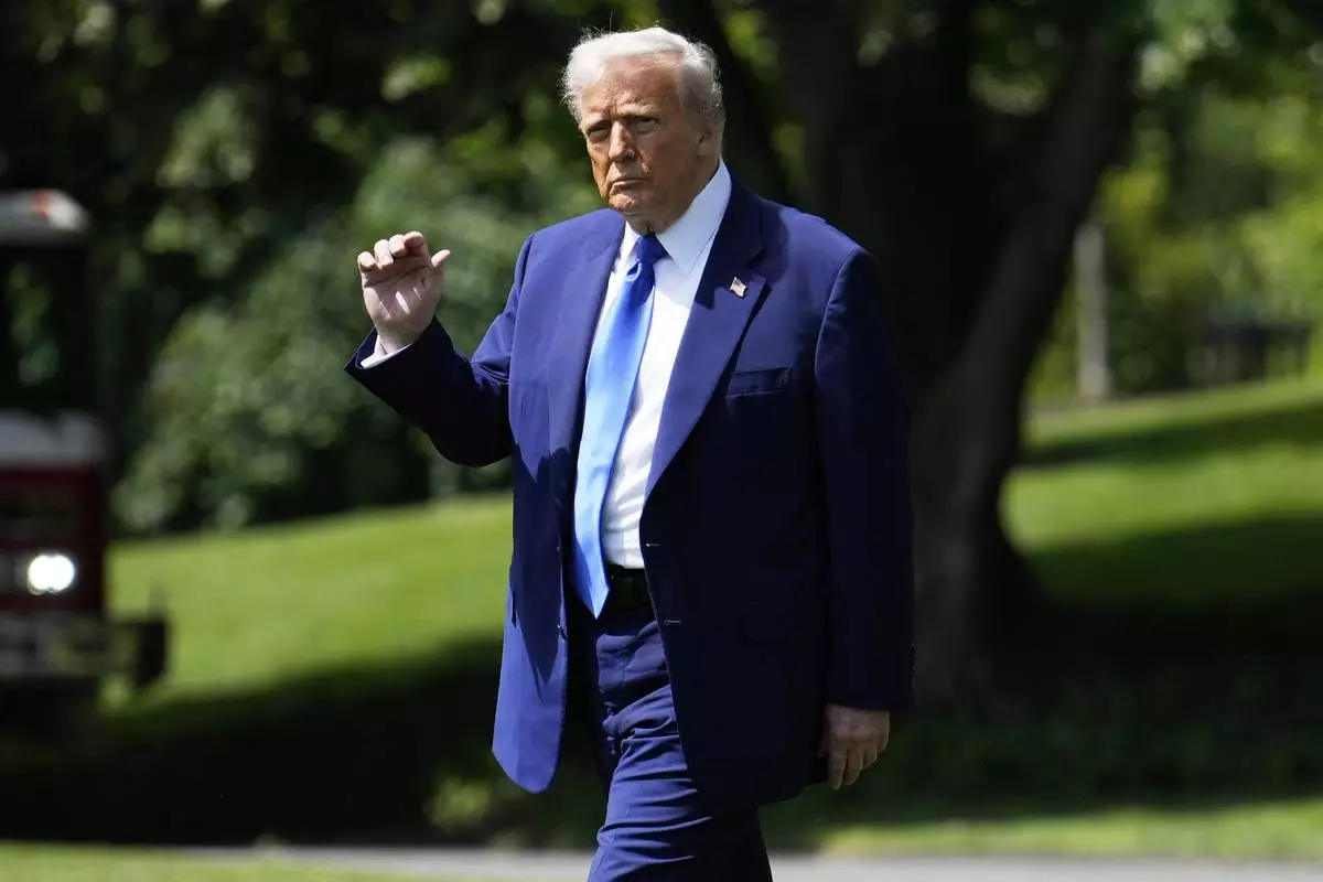 President Donald Trump walks across the South Lawn of the White House to board Marine One en route to Joint Base Andrews, Md., to begin a trip to the Middle East, Monday, May 12, 2025, in Washington. (AP Photo/Mark Schiefelbein)