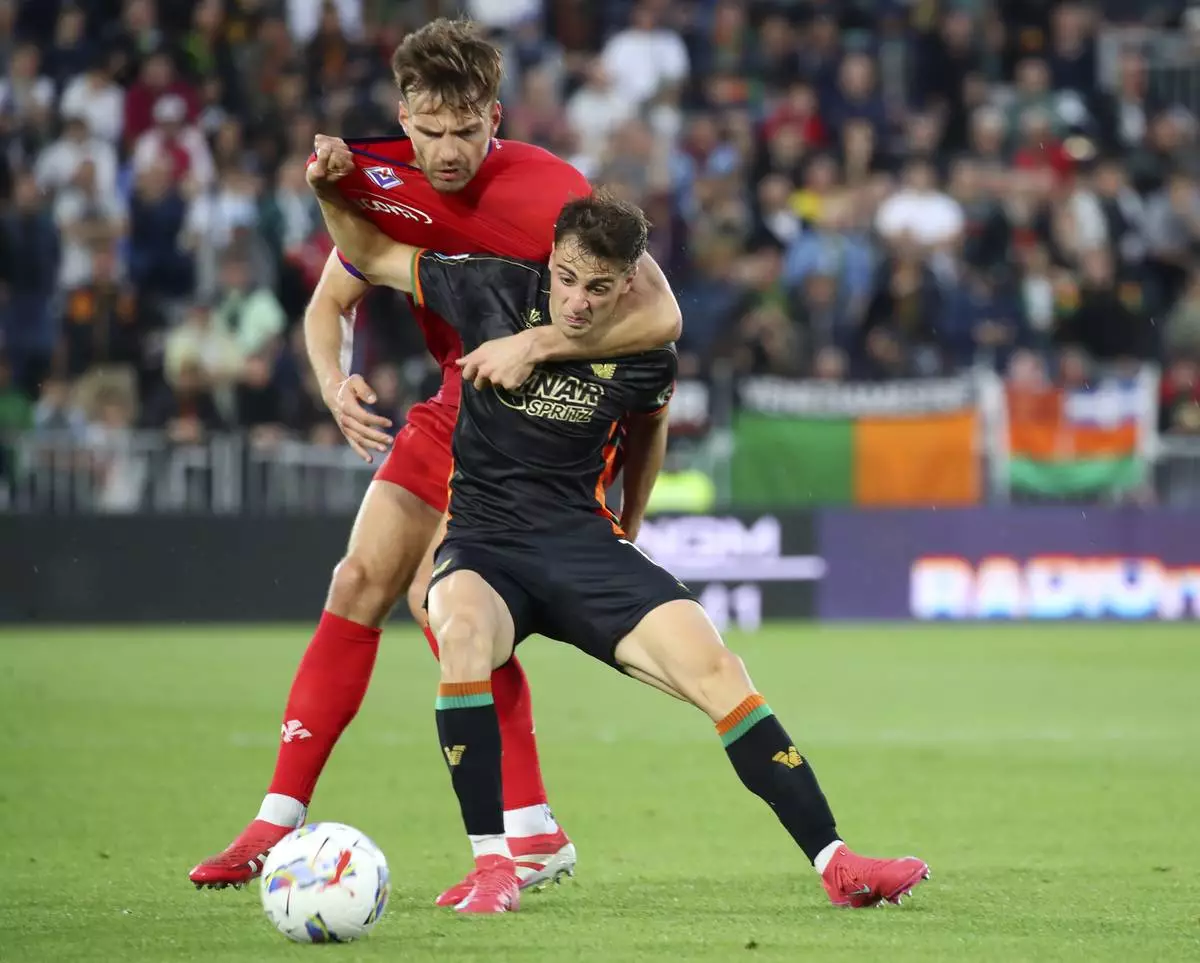 Venezia's Gaetano Oristanio, right, and Fiorentina's Marin Pongracic, left, challenge for the ball during the Serie A soccer match between Venezia and Fiorentina in Venice, Italy, Monday, May 12, 2025. (Paola Garbuio/LaPresse via AP)