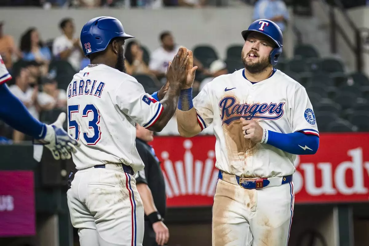 Texas Rangers' Jake Burger celebrates a run with Texas Rangers' Adolis Garcis during the eighth inning of a baseball game against the Athletics, Tuesday, April 29, 2025, in Arlington, Texas. (AP Photo/Jessica Tobias)