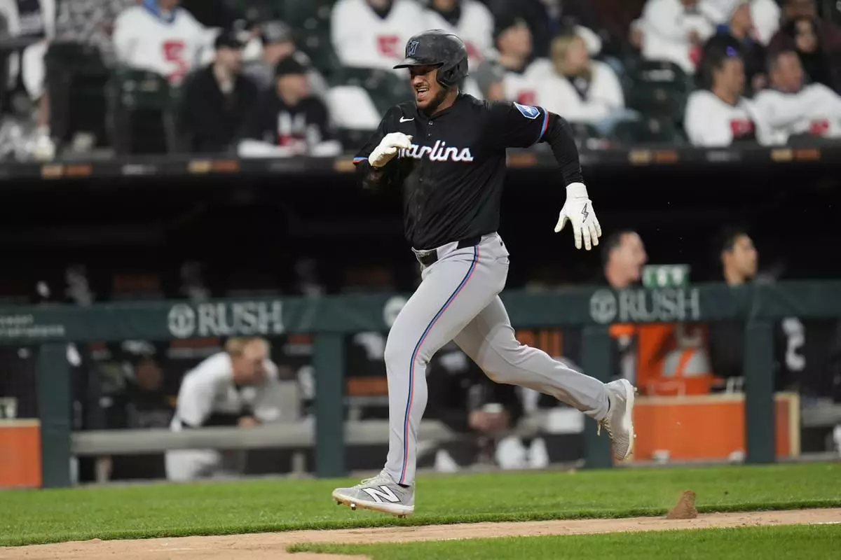 Miami Marlins' Dane Myers runs the bases to score on a triple by Eric Wagaman during the eighth inning of a baseball game against the Chicago White Sox, Saturday, May 10, 2025, in Chicago. (AP Photo/Erin Hooley)