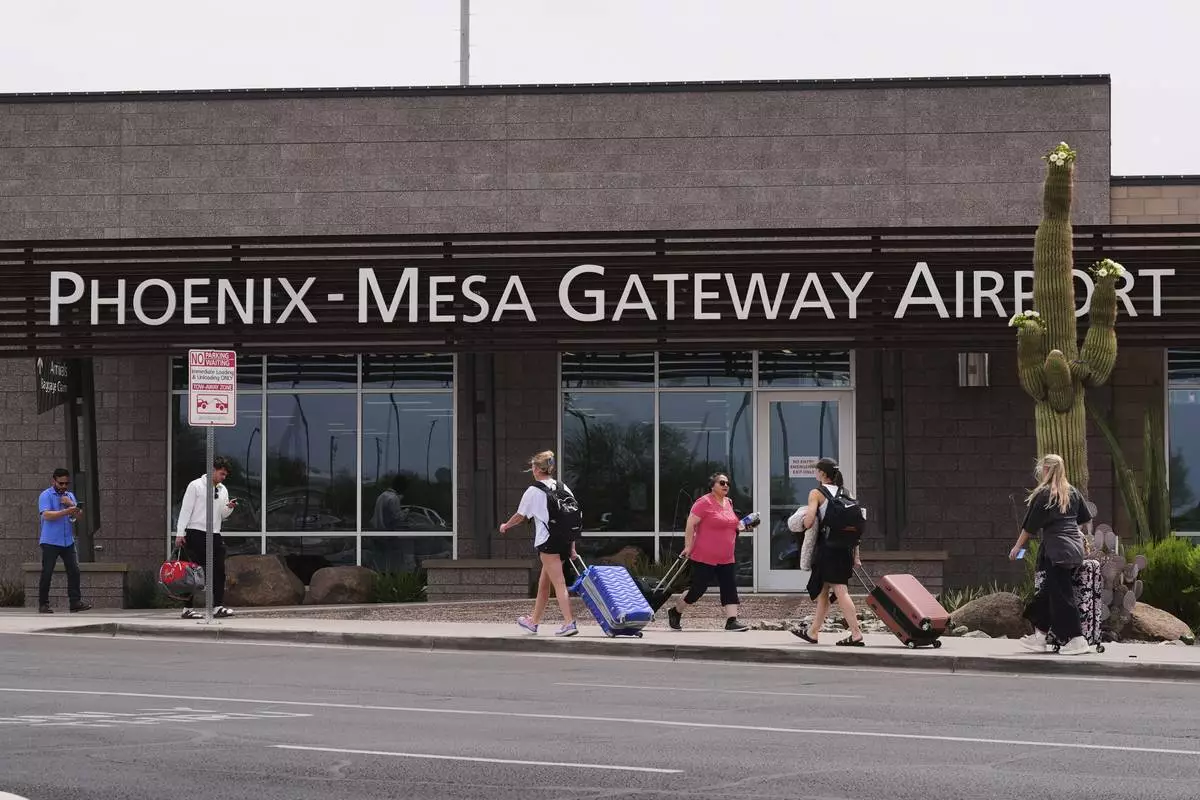 Passengers walk in front of Mesa Gateway Airport, where Avelo Airlines started making deportation flights on behalf of the federal government on Monday, May 12, 2025, in Mesa, Ariz. (AP Photo/Ross D. Franklin)