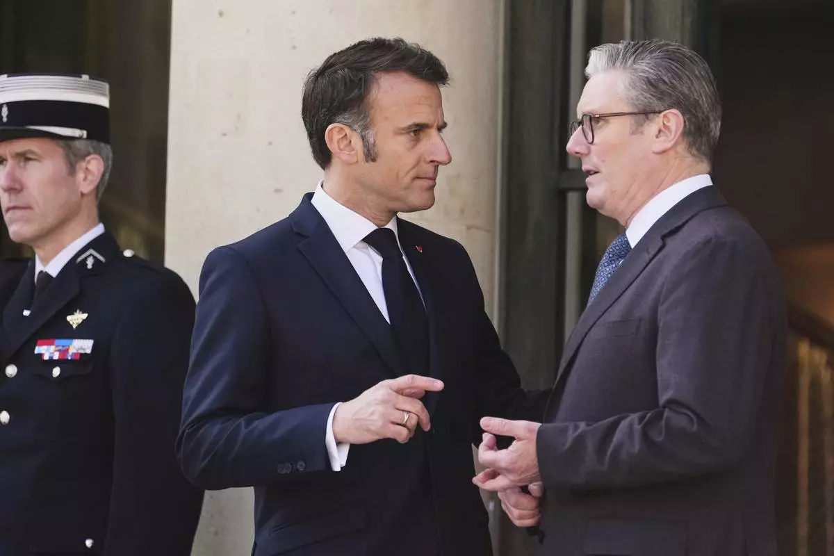 FILE - French President Emmanuel Macron, center, speaks with Britain's Prime Minister Keir Starmer during arrivals for a summit on Ukraine at the Elysee Palace in Paris, on March 27, 2025. (AP Photo/Thibault Camus, File)