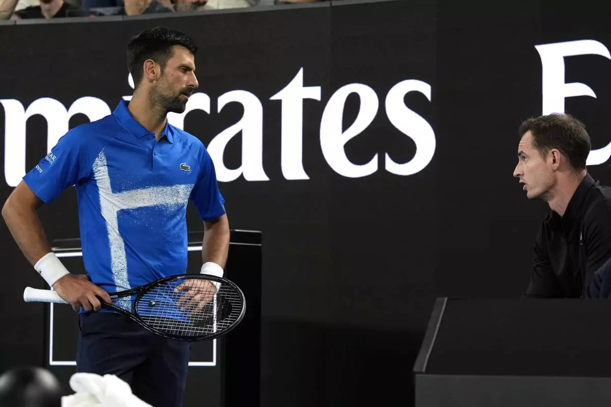 FILE - Novak Djokovic, left, of Serbia talks with his coach Andy Murray during his first round match against Nishesh Basavareddy of the U.S. at the Australian Open tennis championship in Melbourne, Australia, Monday, Jan. 13, 2025. (AP Photo/Asanka Brendon Ratnayake, file)